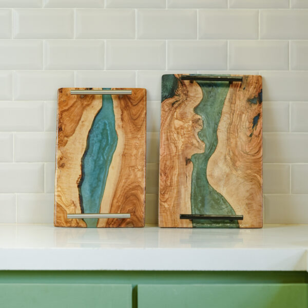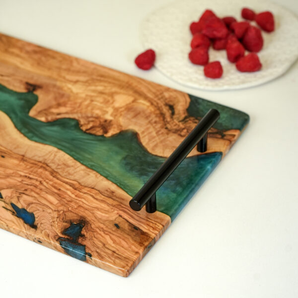 Sublimez votre cuisine ou votre espace repas avec notre plateau artisanal en bois d’olivier et résine époxy, où la nature rencontre l’élégance contemporaine. Chaque pièce est entièrement façonnée à la main dans notre atelier familial, à partir de bois d’olivier de première qualité et de résine alimentaire colorée.