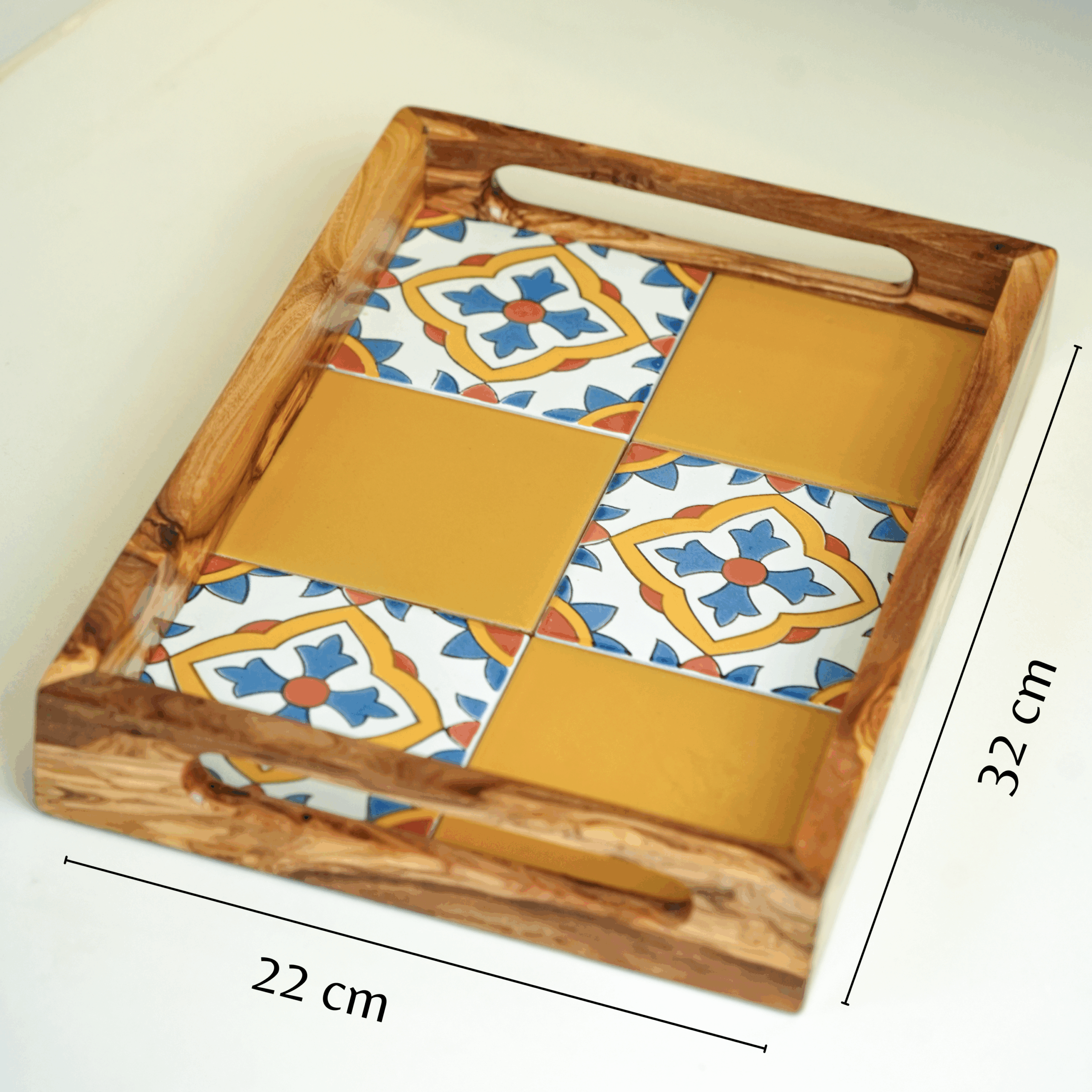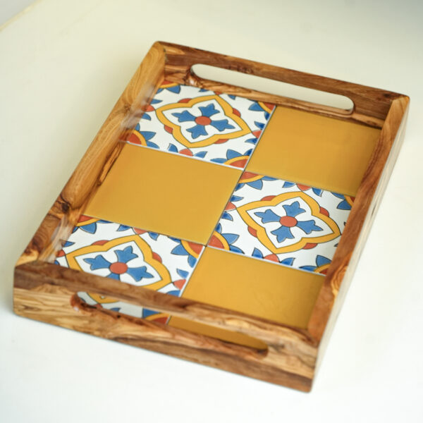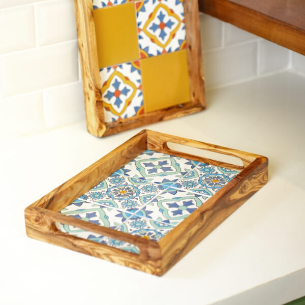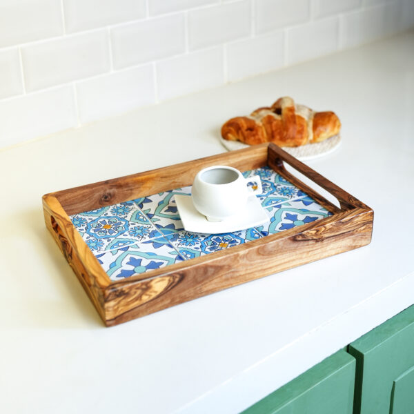Fabriqué avec soin à partir de bois d’olivier tunisien issu de sources durables, ce plateau marie la chaleur du bois naturel aux incrustations en céramique peintes à la main, pour un rendu authentique et raffiné.